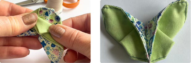 The fabric choice proved to be key; stiff fabrics fold crisply but are often too heavy and bulky. Cottons fold well into crisp points but are generally quite soft and floppy. The solution was to apply fusible interfacing to the back of one of the fabrics before stitching them together. This gave just enough structure without becoming bulky. Perfect!