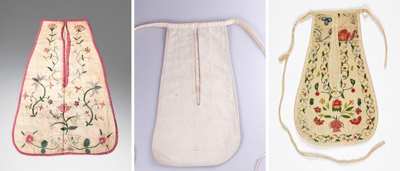 Men’s pockets have always been built into their clothing, but pockets for women were an entirely separate garment. They were worn under the clothing, hung from the waist beneath voluminous skirts and were considered to be undergarments. Although these pockets were often beautifully embroidered to match the outer garments, they were highly impractical as they were very difficult to access. The pocket was considered a symbol of inequality in society by many as women did not have the luxury of having pockets incorporated into their clothing.