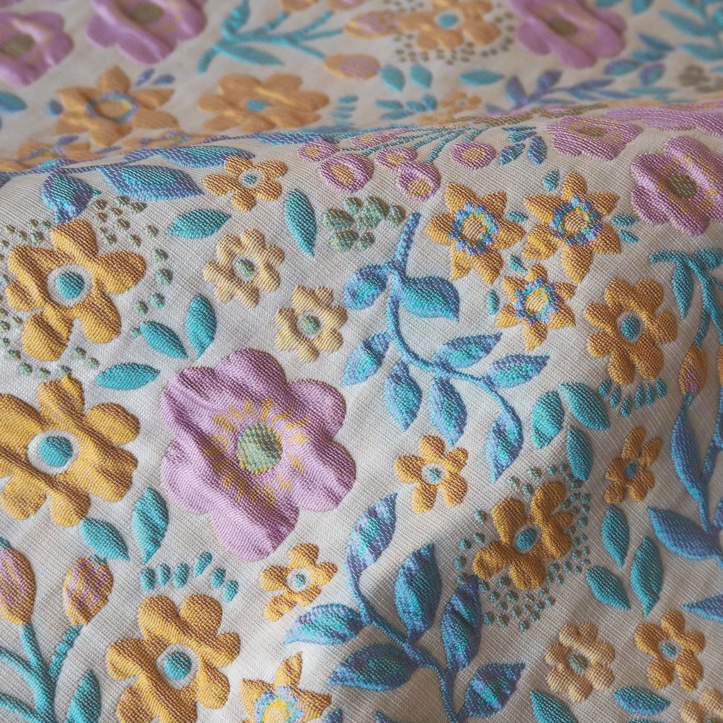 I found this beautiful floral jacquard fabric at Guthrie & Ghani. With a retro feel and a raised texture, this fabric could work well in many sewing projects from clothing and accessories to home decor. The soft blues, pinks and yellows are perfect for spring, reminding us that sunshine, blue skies and blossoms are not far away!