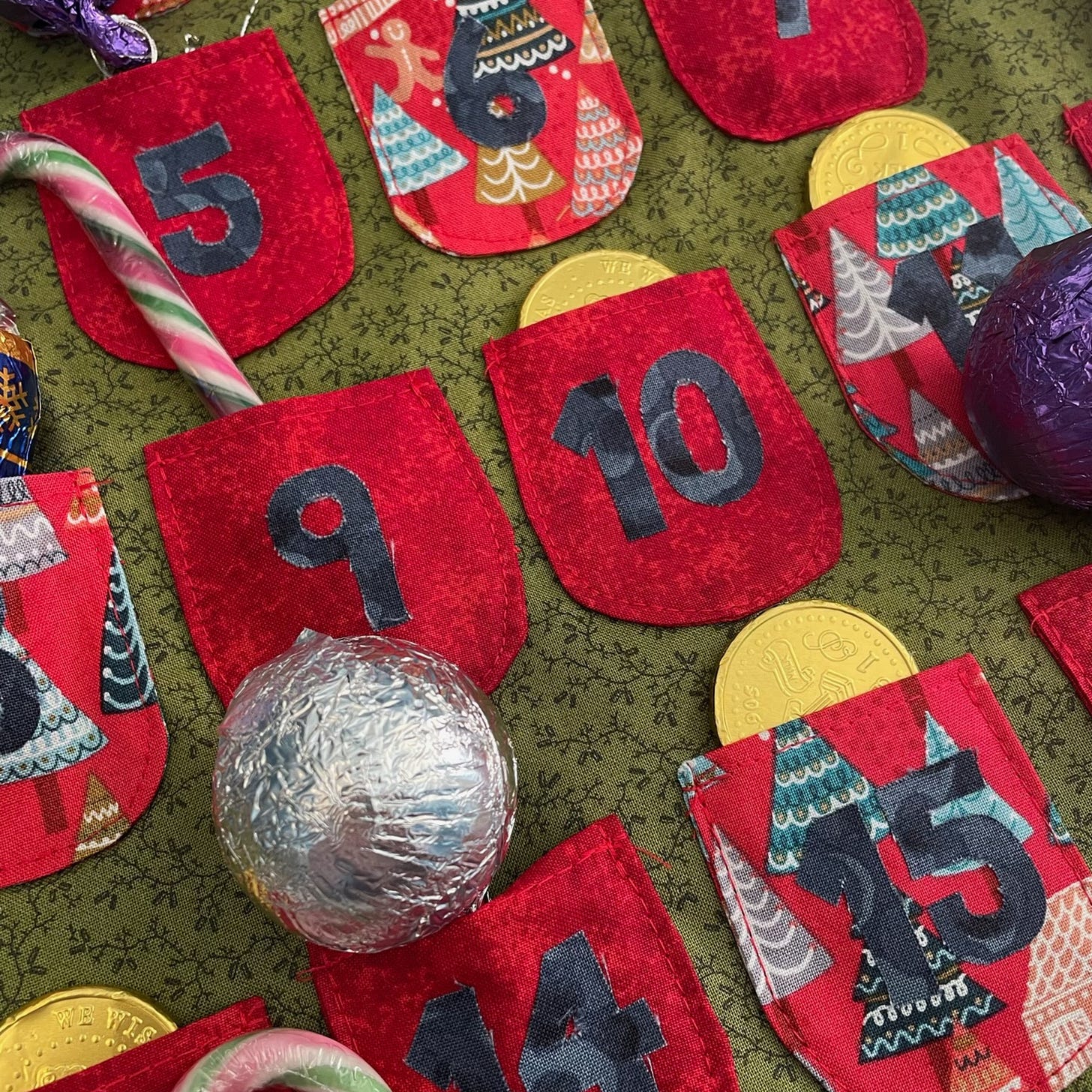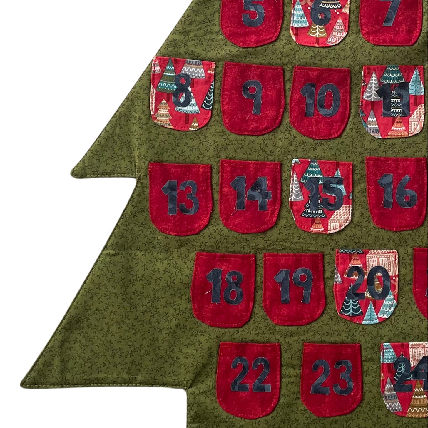 I used my Cricut to speed up the making of the numbers, but this could also have been accomplished with sharp scissors, albeit a little slower. The pockets were simple to construct, and I used Bondaweb to fuse the numbers in place once the pockets were complete. Then when the pockets were stitched in place on the tree, the backing fabric was attached and the whole thing turned out and given a good press. The simple star adorning the top of the tree hides the hanging loop.